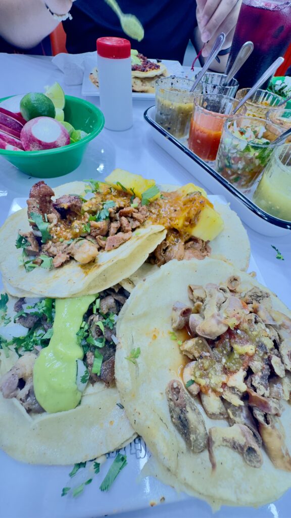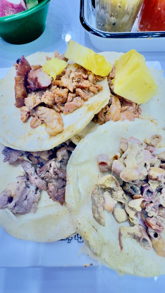 Intenté pedir adobada, pero me llevé la sorpresa de que ya no estaba en el menú; un movimiento extraño para una apertura reciente que debería mostrar consistencia. Pedimos entonces tacos y gringa: pastor, chorizo, sirloin y tripa. Esta última llegó bien dorada, con una textura que prometía, pero con un sabor deficiente. Suena contradictorio, pero un exceso de grasa opacaba por completo a la tripa, como si hubiera pasado por varias recalentadas en la plancha antes de llegar a la mesa. El chorizo seguía una línea similar; mucha grasa, aunque en este caso el sabor sí lograba defenderse un poco mejor.